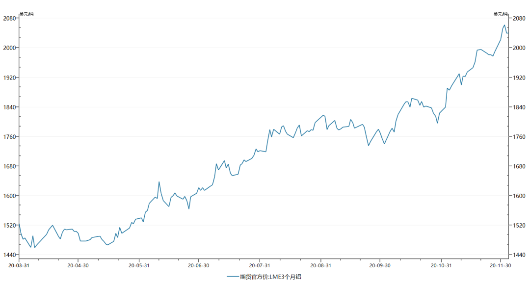 铝的价格也同步上涨,幅度和铜类似。