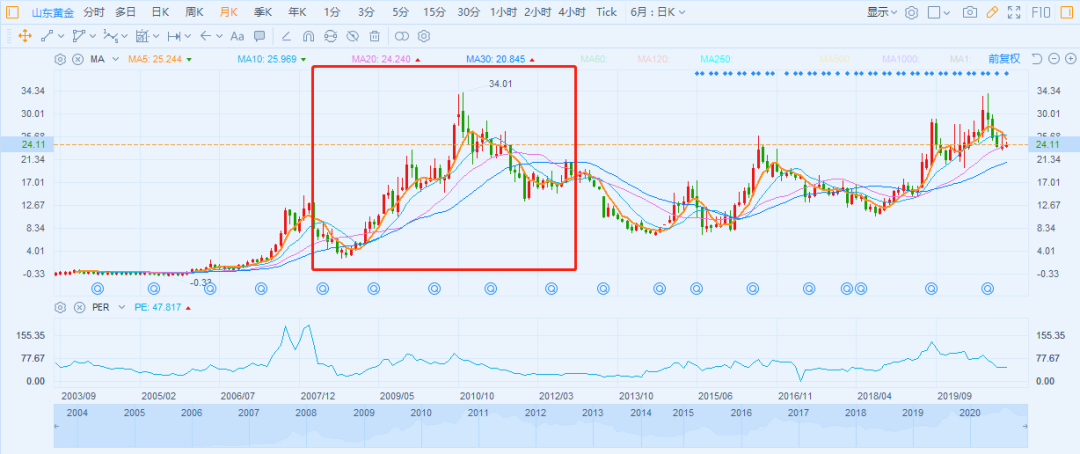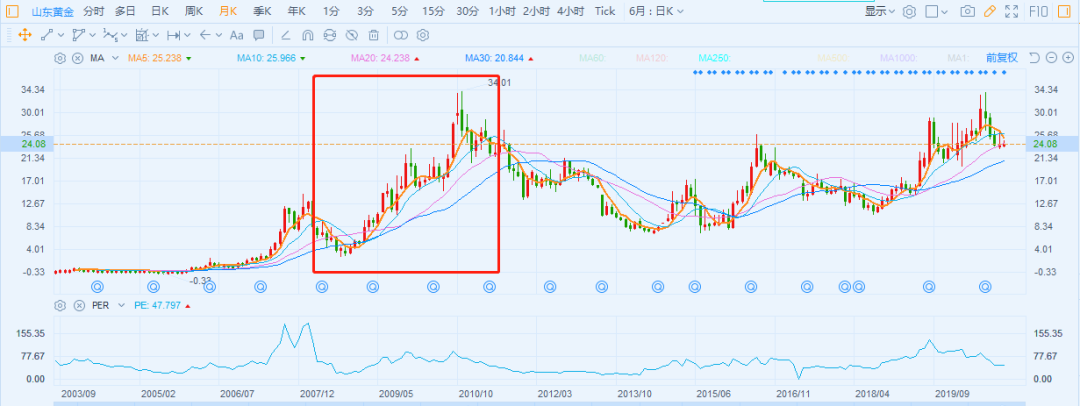 间接带动国内黄金龙头山东黄金,在2008年后迅速反弹并创出新高。