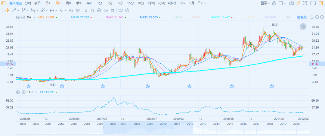 在煤炭价格的带动下,前面提到的兖州煤业股价也一路走高,在2011年7月到达顶峰。