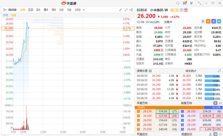 12月8日消息,小米短线拉升,现涨4.17%,现报26.2港元,最新市值6324亿港元。