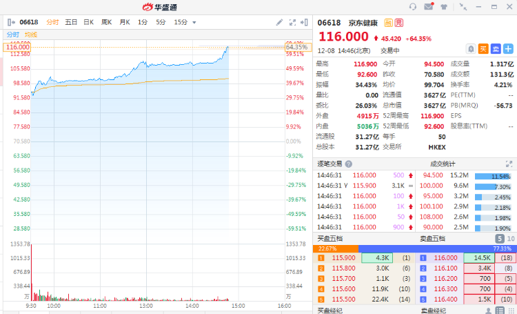 12月8日消息,京东健康涨幅持续扩大,现涨64.35%,报116港元,最新市值3600亿港元。