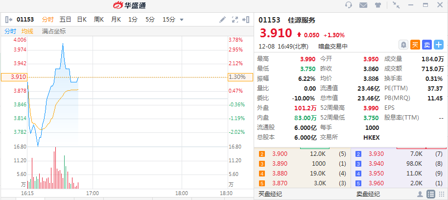 佳源服务(01153)暗盘交易正在进行,截至发稿,暗盘交易显示报价3.91港元,较招股价3.86港元涨1.30%。该股将于12月9日(周三)在香港挂牌。