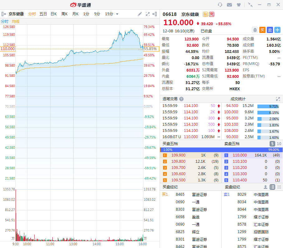 华盛资讯12月8日讯,京东健康(06618.HK)首挂收涨55.85%,报价110.0港元。全日最高价123.9港元,最低价92.6港元,最新总市值3439亿港元,成交额160.3亿港元,一手盈利1971港元。