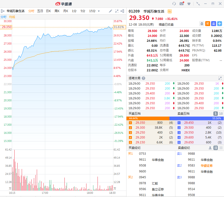 华盛资讯12月8日讯,截至收盘:华润万象生活(01209.HK)暗盘收盘报价29.35港元,较发行价22.3港元涨幅为31.61%,一手账面盈利1410港元。最新成交额3.2亿港元,总市值为645.7亿港元;佳源服务(01153.HK)暗盘收盘报价3.89港元,较发行价3.86港元涨幅为0.78%,一手账面盈利30港元。最新成交额1010万港元,总市值为23.34亿港元,两股都将于明日正式上市。