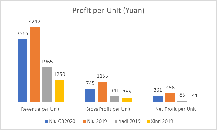 小牛电动的每辆车净利润从2019年的人民币498元下降到2020年第三季度的人民币361元。相反,雅迪的每辆车净利润从2019年的人民币85元增长到2020年第二季度的人民币95元。