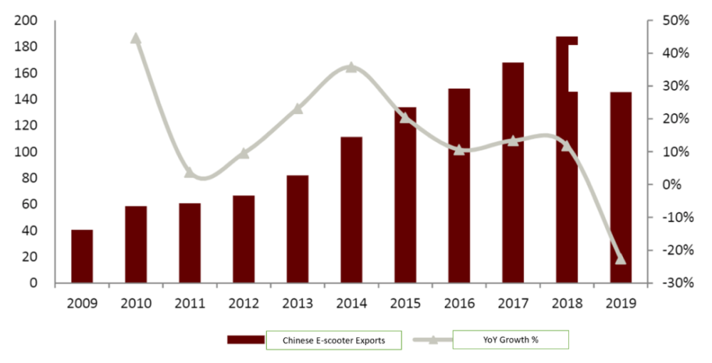 如下图所示,2019年中国电动代步车出口增长大幅下降。印度和印度尼西亚是潜在的大市场。小牛电动目前在印尼被征收40%的关税。