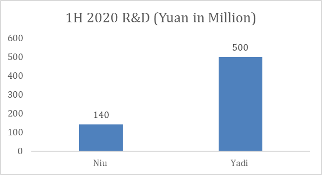电动自行车市场领导者雅迪在研发的投入比小牛电动多得多。2019年6月,雅迪推出了其创新的石墨烯电池产品。这种类型的电池可以在两个小时内充满电,电池寿命延长2倍。