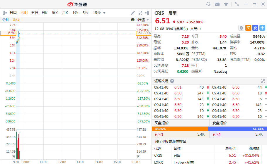 华盛资讯12月8日消息,美股盘初,抗癌药公司居里(CRIS)高开高走放量拉升,截至北京时间22:41,该股涨幅扩大至352.08%,报6.51美元。