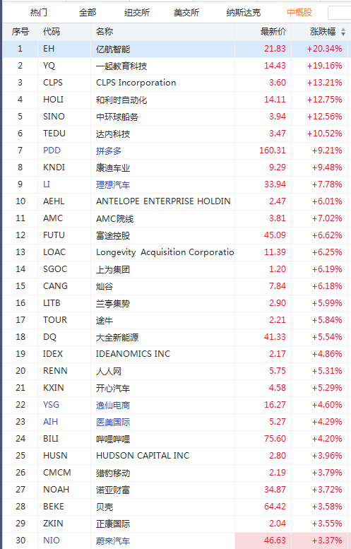 其他中概股中,亿航智能涨超20%,一起教育科技涨超19%;理想汽车涨约8%,蔚来、小鹏涨近4%。网易有道、唯品会涨超2%,网易、阿里巴巴、迅雷涨超1%。与此同时,道指目前下跌44点,纳指跌0.17%。