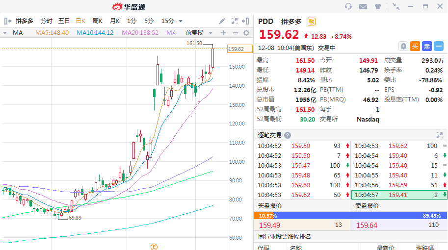 华盛资讯12月8日消息,美股盘初,热门中概股多数逆市上涨,其中拼多多涨超8%,股价刷新盘中历史新高,市值超1950亿美元,今年迄今涨超320%;哔哩哔哩涨超4%,续创盘中纪录新高。