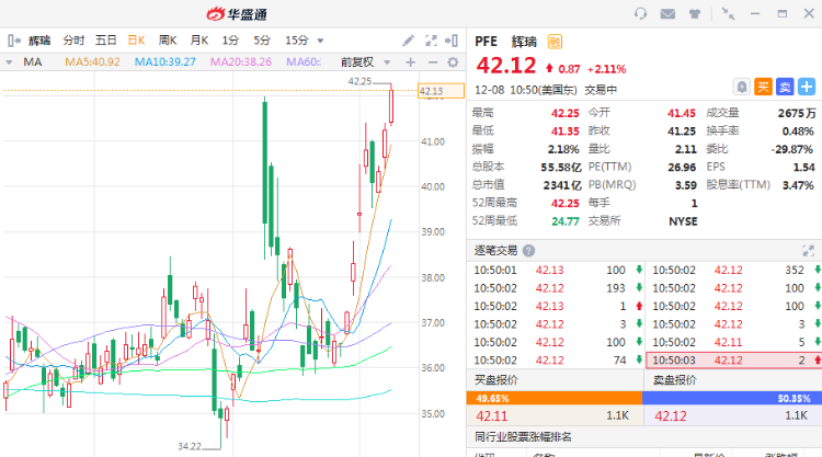 华盛资讯12月8日消息,辉瑞盘中涨超2%,创下两年以来新高。