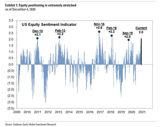 这与高盛发出的警告惊人地相似。高盛发布了几乎相同的警告,当时高盛观察到其情绪指标现在比平均水平高出2.0个标准差。