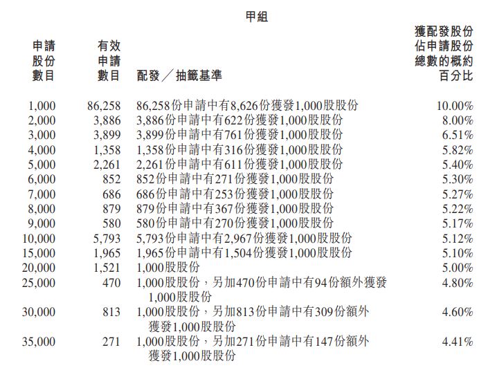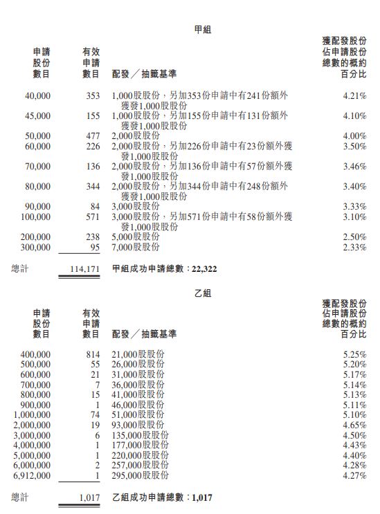 根据香港公开发售初步提呈发售的香港公开发售股份已获超额认购。合共接获115,188份有效申请,认购合共1,085,797,000股香港公开发售股份,相当于根据香港公开发售初步可供认购的香港公开发售股份总数13,824,000 股约78.54倍。