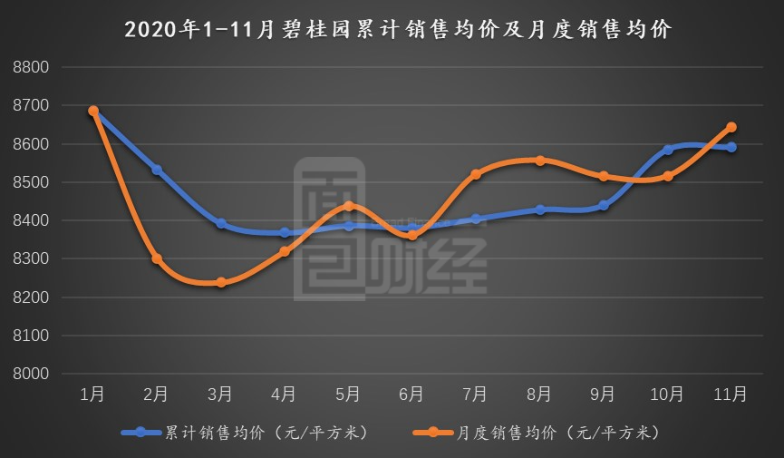 销售均价方面,根据销售面积及销售金额计算,2020年11月,碧桂园当月销售均价为8644.48元/平方米,环比增加0.02%,同比增加4.34%。1-11月,碧桂园累计销售均价为8591.27元/平方米,环比增加0.07%,同比下降3.05%。