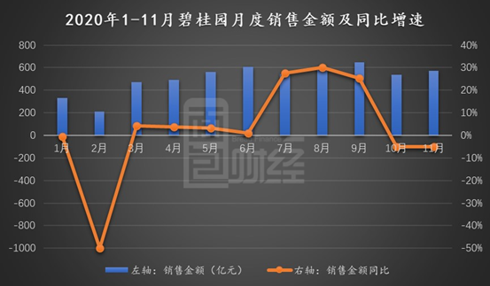 碧桂园此前公告的运营数据显示,公司2020年11月实现合同销售金额(权益口径,下同)571.4亿元,同比下降5%;实现合同销售面积(权益口径,下同)661万平方米,同比下降8.98%。
