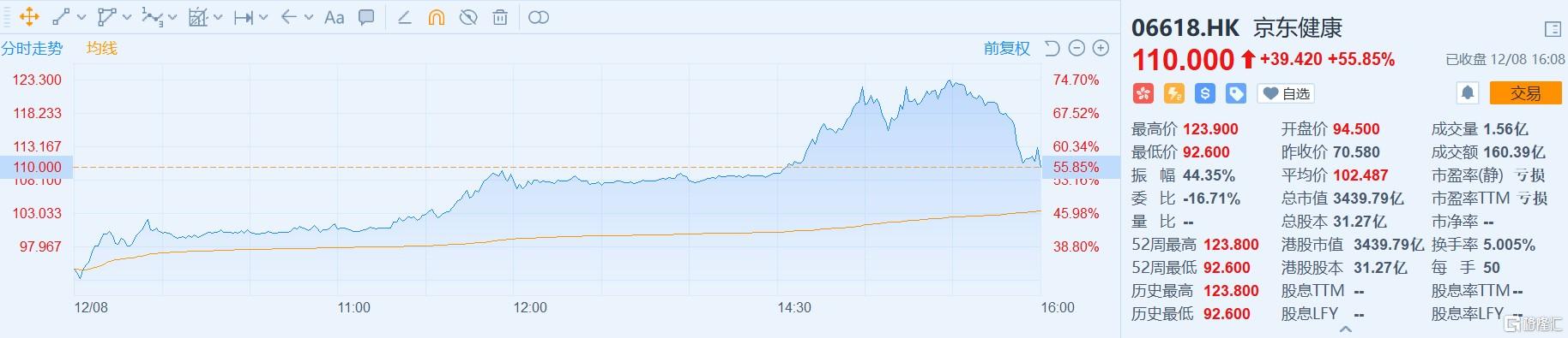 12月8日,京东健康正式登陆港交所,创下亚洲医疗保健行业最大IPO的记录。截至收盘,京东健康上市首日股价大涨55.85%,盘中一度涨逾75%,报收110港元。当前京东健康总市值达到3440亿港元,超越阿里健康。