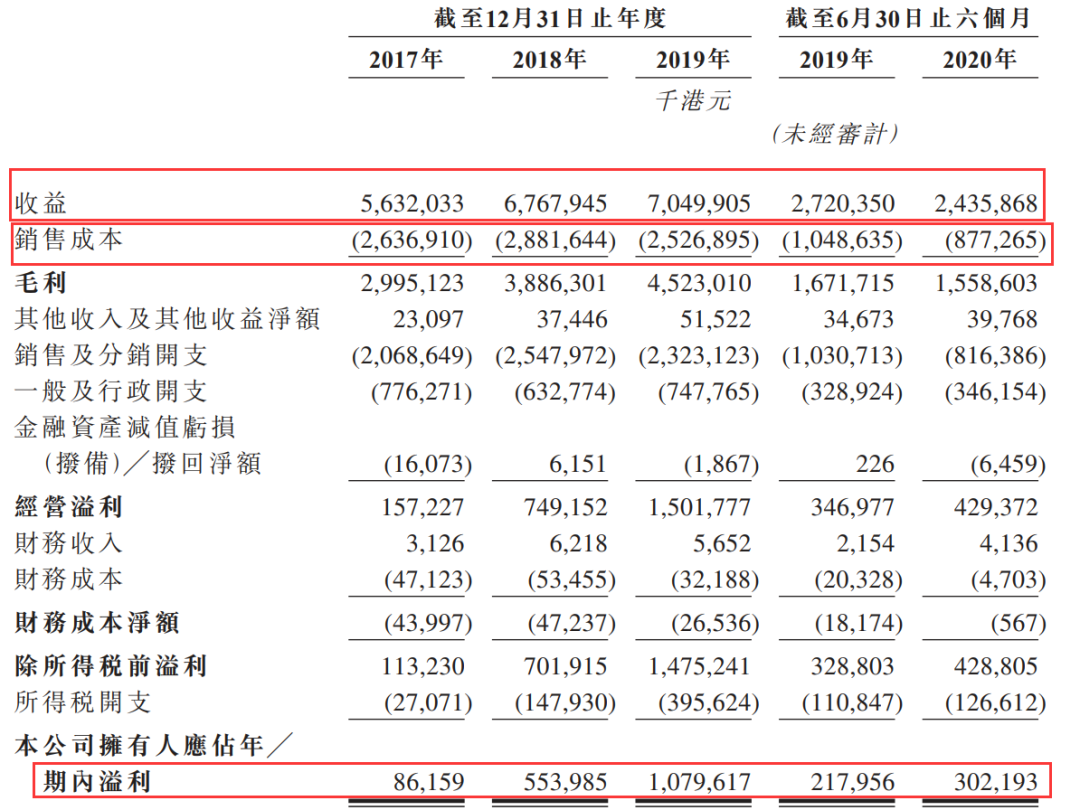 2017-2019年,营收分别为:56.3亿港币、67.7亿港币、70.5亿港币;2020上半年,这一数字为24.36亿港币。按年度算,营收的复合年增长率约为11.9%。