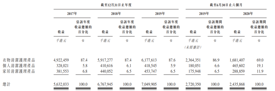 上图可以看到,蓝月亮虽然拥有几乎全套家居清洁产品,但是目前衣物清洁护理产品仍然占其营收的大头,且这一占比有增加趋势。2017-2019年分别为87.4%、87.4%、87.6%。2020年上半年将至69%,主要是黑天鹅的影响导致个人清洁护理产品的占比提升。但总的来看,其衣物清洁产品仍然占据营收的绝对优势。