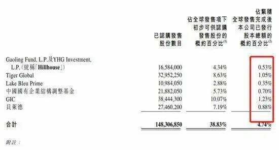 本次IPO,京东健康还引入了6名基石投资者,包括高瓴资本、Tiger Global、Lake Bleu Prime、中国国有企业结构调整基金、新加坡政府投资公司(GIC Pte)、贝莱德集团(BlackRock),合计认购,总额13.5亿美元(约104.67亿港元),占比38.83%,禁售期为6个月。