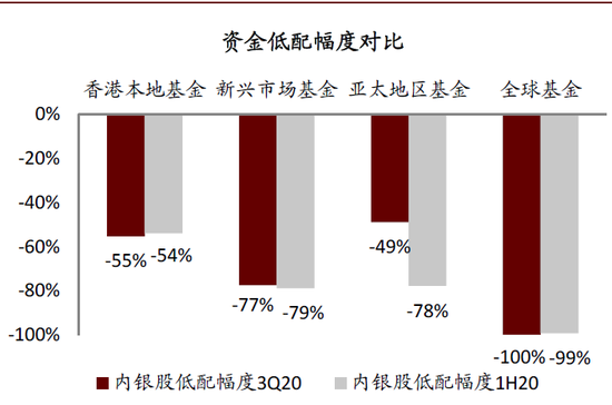我们将港股市场上各类基金中规模较大的作为样本,追踪其持仓情况,整体而言3Q末内银股低配幅度较2Q末改善有所改善,其中亚太地区基金低配幅度由2Q末的78%下降为3Q末的49%,新兴市场基金低配幅度由79%下降至77%,香港本地基金和全球基金对内银股的低配幅度环比基本持平。