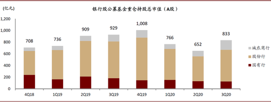我们统计了公募基金重仓持股情况,持仓中银行股市值由4Q19的1008亿元,下降至1Q20的766亿元,下降至2Q20的652亿元,而3Q20回升至833亿元,仓位跟随基本面预期开始反转,但仍低于去年末的水平。