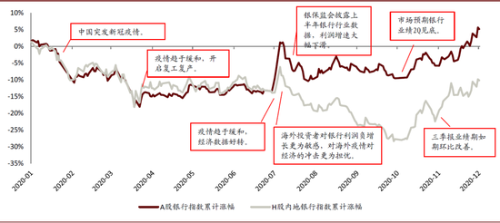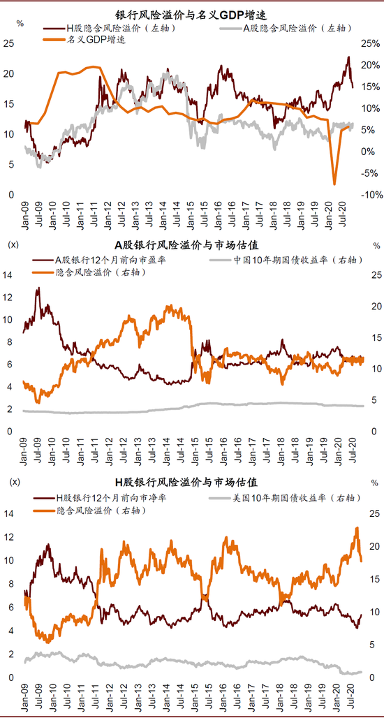 9月末以来,A股和H股银行指数已较低位上涨16%和25%,部分市场参与者对银行股上涨的可持续性和上涨空间存在疑虑。我们认为,目前银行处于未来5个季度业绩V型反转的起点,处于风险溢价因素反转的起点,处于估值仓位反转的起点。宏观经济复苏趋势明确,流动性环境亦有利于银行业绩表现,向前看,我们预计A股和H股银行指数未来3-5个季度的上涨空间分别为50%和60%。