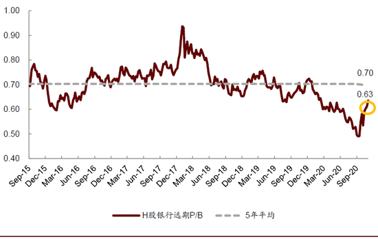 A/H银行估值和股价亦然出现反转,A股银行估值由9月末0.71x前瞻一年P/B的低点上升至当前的0.79x(上涨11%),H股银行估值由9月末0.49x前瞻一年P/B的低点上升至当前的0.65x(上涨23%),我们预计未来3-5个季度仍有50%/60%的上涨空间。