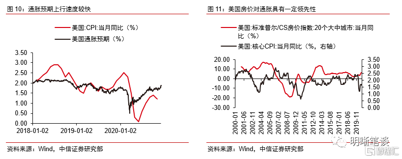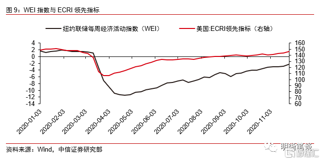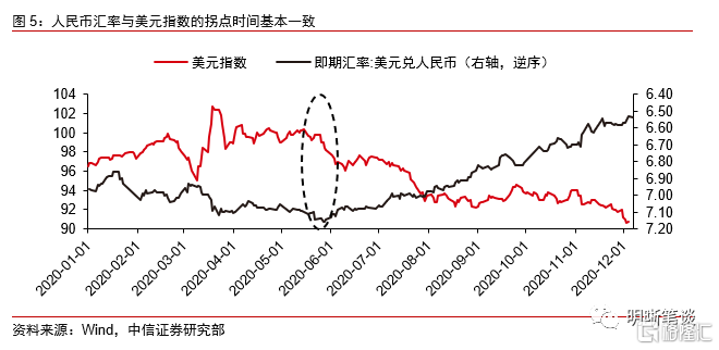 但对于美元指数来说,我们认为明年在基本面因素和美联储货币政策的影响下,美元指数可能获得支撑,因此人民币受到美元走弱带来的升值压力或也将有所减轻。对于美元指数而言,虽然当前美元指数正处于持续走弱的过程当中,但我们认为明年美元指数可能获得支撑。做出这种判断的理由主要出于两点原因,一方面根据纽约联储每周更新的经济活动指数(WEI指数)以及美国ECRI领先指标,当前美国经济正处于边际修复的进程当中。而从疫苗的研发进展来看,近期有关新冠疫苗的积极消息逐渐增多,因此明年随着美国经济逐渐复苏美元或受到基本面因素的支撑。另一方面,美联储货币政策未来如何演变同样值得关注。目前拜登上台出任下一届美国总统已成大概率事件,虽然拜登对于防控疫情以及修复由疫情带来的经济问题非常重视,而疫情当中的经济修复需要货币政策与财政政策的共同发力,短期来看美联储的货币政策仍将以宽松的基调为主。但对于稍远的时间,目前美国通胀预期上行的速度较快,同时从房价的角度当前美国房地产行业表现亮眼,房价上涨较多,美国房价对于通胀而言也具有一定的领先性。考虑到后续美国经济复苏脚步加快叠加可能到来的通胀影响,美联储货币宽松的脚步或将出现放慢收敛。结合以上两点原因,我们认为明年在基本面因素和美联储货币政策的影响下,美元指数可能获得支撑,因此人民币受到美元走弱带来的升值压力或也将有所减轻。