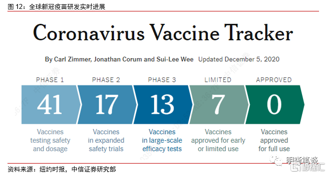 对于近期海外市场需要关注的第三个重点我们认为是新冠疫苗研发的进展情况。根据《纽约时报》披露的新冠疫苗实时跟踪数据,当前全球进入临床三期的疫苗共计13款。根据各医药公司披露的数据,如Moderna和BioNTech、辉瑞、复星研制的两款疫苗有效率均达到90%以上。对于近期海外市场需要关注的第三个重点,我们认为是新冠疫苗的进展情况。根据《纽约时报》Coronavirus Vaccine Tracker专栏对于新冠疫苗研发进展的实时数据追踪,当前进入临床三期的新冠疫苗共有13款。新冠肺炎疫情出现到现在已经过了接近一年时间,新冠疫苗的研制也已经过了一段时间。近阶段有关新冠疫苗的积极消息频频出现,如11月18日由BioNTech、辉瑞和复星联合研制的新冠疫苗三期临床最终结果显示,这一款新冠疫苗的有效率高达95%。两周之后,11月30日美国疫苗公司Moderna发布疫苗临床试验的最终数据,数据显示疫苗对于新冠病毒感染的防范有效率达到94.1%。