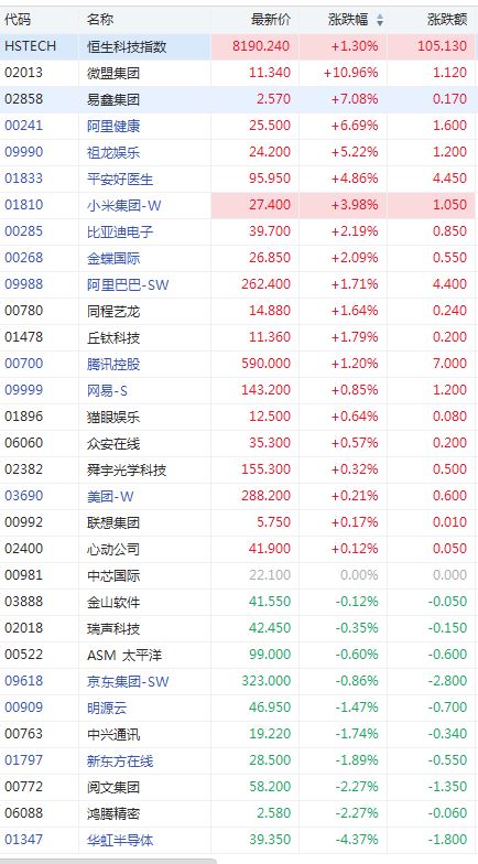 微盟集团大涨10%领涨指数成分股;易鑫集团涨7%;阿里健康涨超6%。