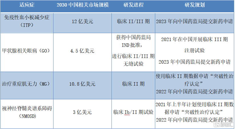 从适应症上来看,目前公司已经确定首批主要适应症,其中包括免疫性血小板减少症(ITP),甲状腺相关眼病(GO),重症肌无力(MG)以及视神经脊髓炎谱系障碍(NMOSD),其中进程最快的预计将在2022年向中国药监局提交新药上市申请。此外,公司预计将在治疗首批主要适应症之外,计划开展更多适应症,例如温型自体免疫溶血性贫血,慢性脱髓鞘多发性神经炎等适应症。