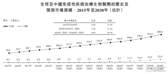 从市场规模上来看,根据Frost&Sullivan数据统计显示,全球有2.5%人口,也就是1.95亿人患有某种形式的自身免疫性疾病。针对自身免疫性疾病治疗的生物制剂,预计2030年全球市场规模达到2096亿美元。中国2019年至2024年年复合增长率达到51.1%,2024年至2030年年复合增长率达到30.7%,预计2030年达到229亿美元。
