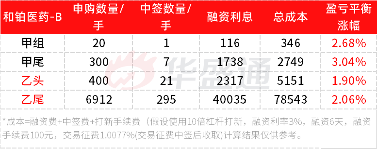 假设采用10倍杠杆,冻资期6天,利率3%,交易征费1.0077%,和铂医药-B的融资打新盈亏平衡点如下: