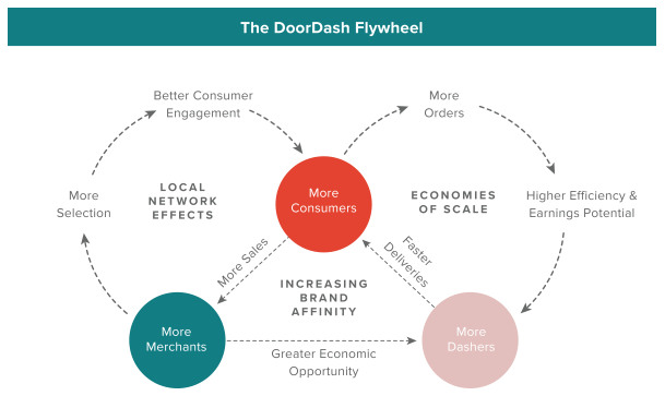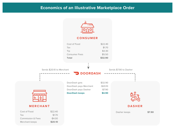 DoorDash的商业模式与美团外卖和饿了么等配送平台非常相似,DoorDash通过将消费者、商家及Dashers(外卖配送员)三者相链接,获取收益。