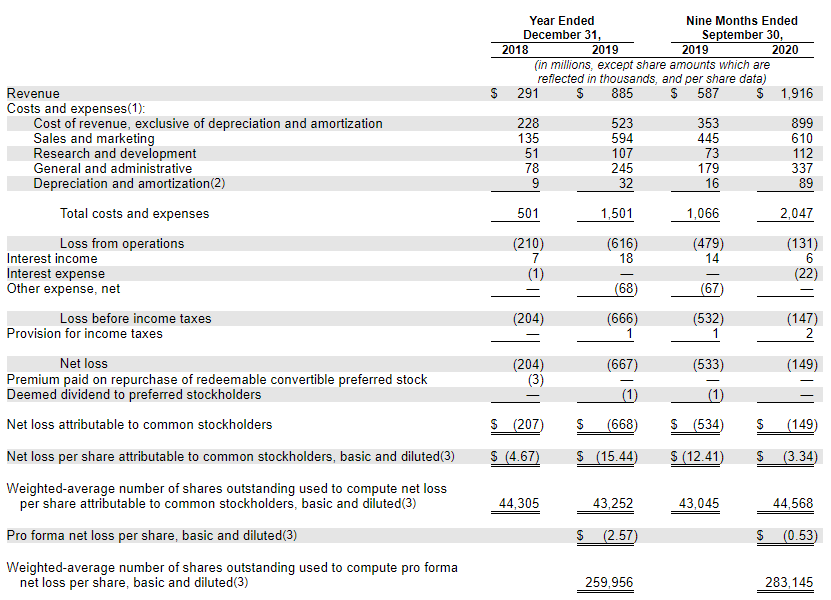 目前DoorDash仍处于亏损状态,2018年和2019年的净亏损分别为2.04亿美元和6.67亿美元;2020年前三季度1.49亿美元的净亏损则较2019年同期的5.33亿美元大幅收窄。