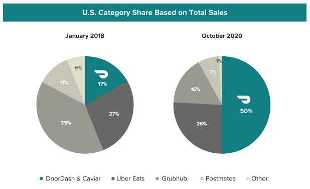 按2020年10月的总销售额计算,DoorDash与Caviar累计占据50%的市场份额(DoorDash在2019年斥资约4.1亿美元完成对竞争对手Caviar的收购),远远领先26%的UberEats、16%的GrubHub、7%的Postmates等其他玩家。