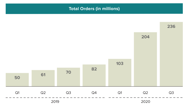由于新冠疫情带来的配送服务需求的增加,2020年,DoorDash订单增速迅猛,其中第三季度,DoorDash订单总量增至2.36亿,较2019年同期增长237%。