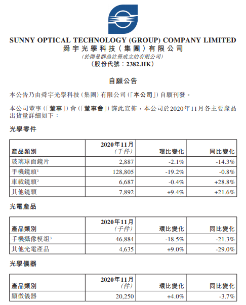 12月9日消息,舜宇光学科技在港交所公告,11月手机镜头模组出货量1.288亿。11月手机摄像模组出货量4688.4万件,同比下降21.3%,环比下降18.5%。