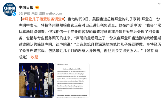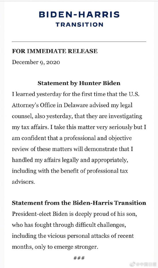 【#拜登儿子接受税务调查#】当地时间9日,美国当选总统拜登的儿子亨特·拜登在一份声明中表示,特拉华州联邦检察官正在对自己进行税务调查。他在声明中说:“我会非常认真地对待调查,但我相信一个专业而客观的审查将证明我合法并妥当地处理了相关事务,包括与专业税务顾问的往来。”声明的最后附上了一份来自拜登和当选副总统哈里斯过渡团队的简短声明,该声明说:“当选总统拜登深深地为他的儿子感到骄傲。亨特经历了众多严峻挑战,包括最近几个月的恶意人身攻击,但他只会变得更强大。”(记者 蒋成龙)