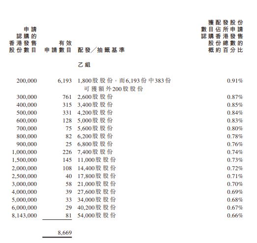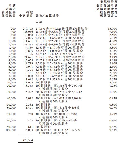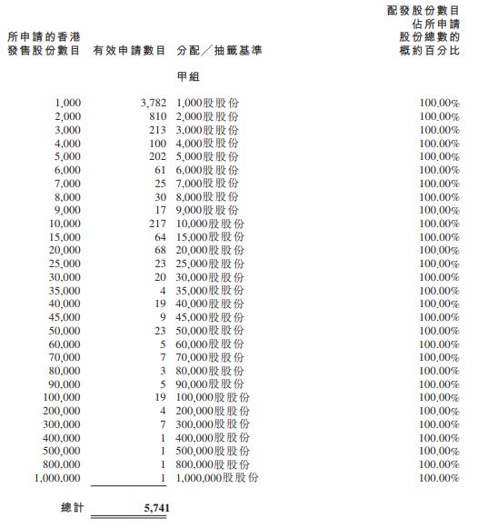 香港公开发售项下初步可供认购的香港发售股份获大幅超额认购。提出的有效申请,认购合共约58.1亿股香港发售股份,相当于香港公开发售项下初步可供认购香港发售股份总数1628.6万股的约356.74倍。因此,香港公开发售项下发售股份的最终数目将增至6378.62万股发售股份,相当于全球发售初步可供认购发售股份总数的约47%(于行使任何超额配股权前)。