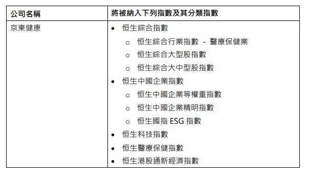 12月9日,恒指公司宣布,京东健康(06618)符合相关指数的快速纳入规则要求,将于2020年12月21日(星期一)收市后被纳入以下指数,并于2020年12月22日(星期二)起生效。