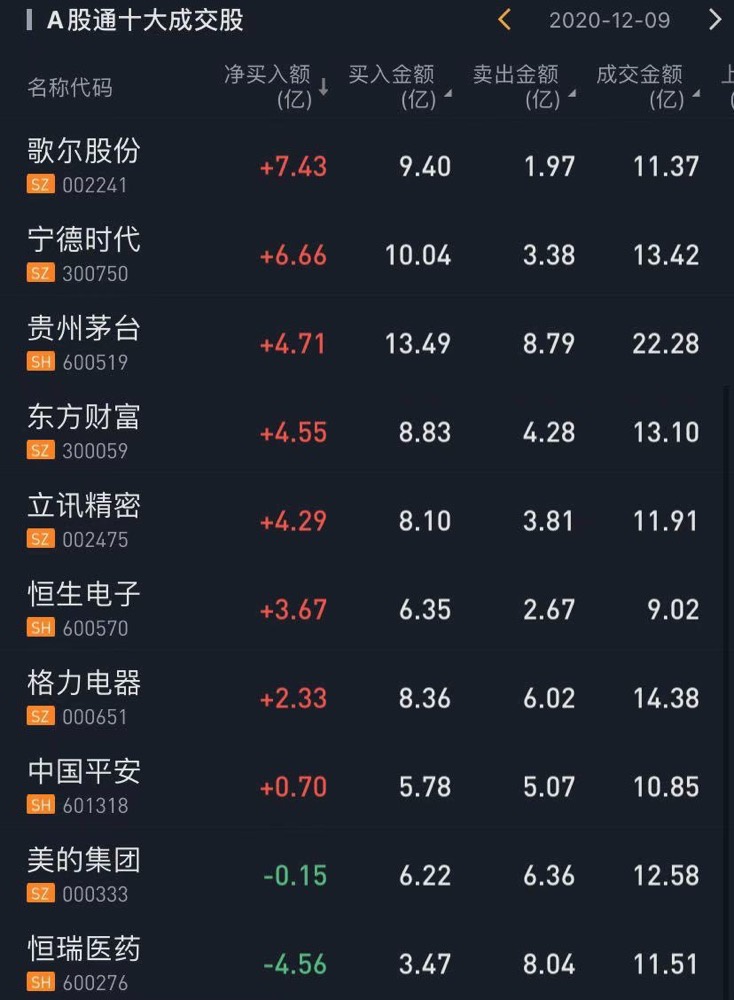 北上资金今日净买入歌尔股份7.43亿元,为今日买入之最。此外,北上资金今日净买入宁德时代6.66亿元,净买入贵州茅台4.71亿元。