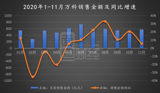 2020年11月,万科实现合同销售金额575.40亿元,同比增加5.5%。今年一季度,公司受疫情影响,房地产销售同比连续负增长;5月份,销售金额同比转正,至11月,公司房地产销售金额同比连续七个月正增长。