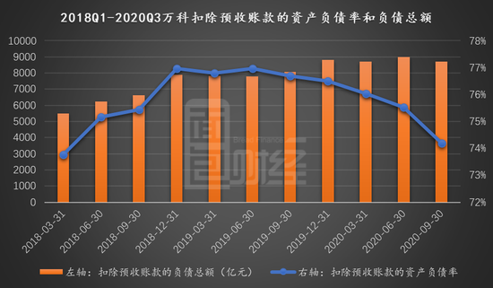 总体来看,万科房地产销售同比持续正增长,拿地风格偏向谨慎,竣工结转明显加快,扣除预收账款的资产负债率持续走低,去杠杆进程加快。2020前三季度,万科扣除预收账款的资产负债率持续走低,但到三季度末仍然高于“达标线”。