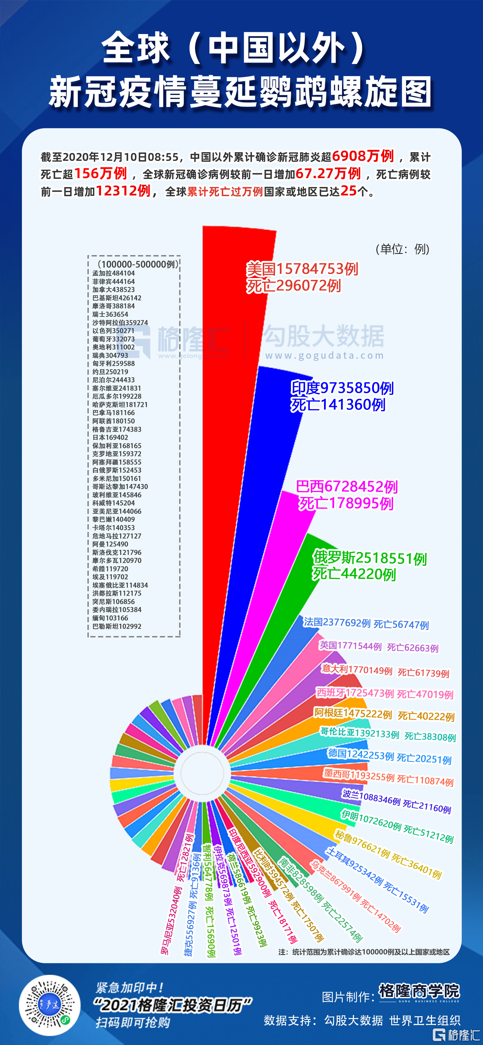 截至2020年12月10日08:55,中国以外累计确诊新冠肺炎超6908万例 ,累计死亡超156万例 ,全球新冠确诊病例较前一日增加67.27万例 ,死亡病例较前一日增加12312例,全球累计死亡过万例国家或地区已达25个。
