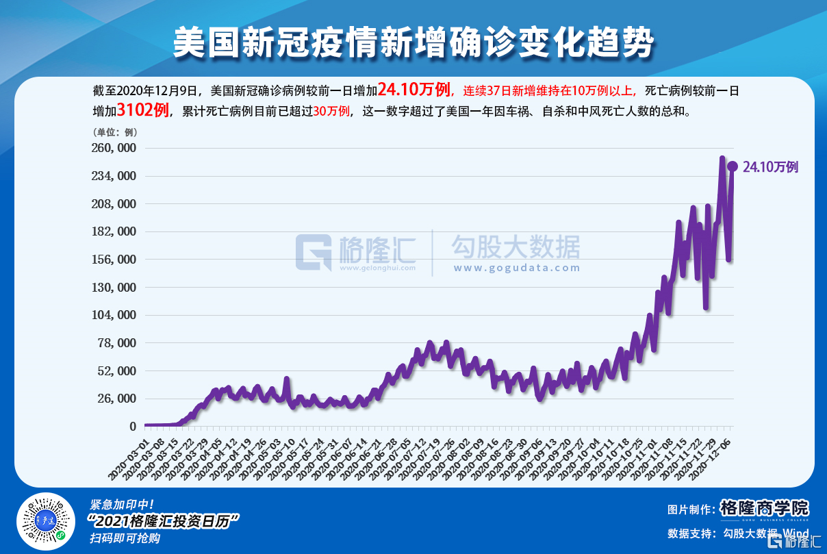 美洲地区,美国新冠确诊病例较前一日增加24.10万例,连续37日新增维持在10万例以上,死亡病例较前一日增加3102例,累计死亡病例逼近30万例,这一数字远超美国一年因车祸、自杀和中风死亡人数的总和。