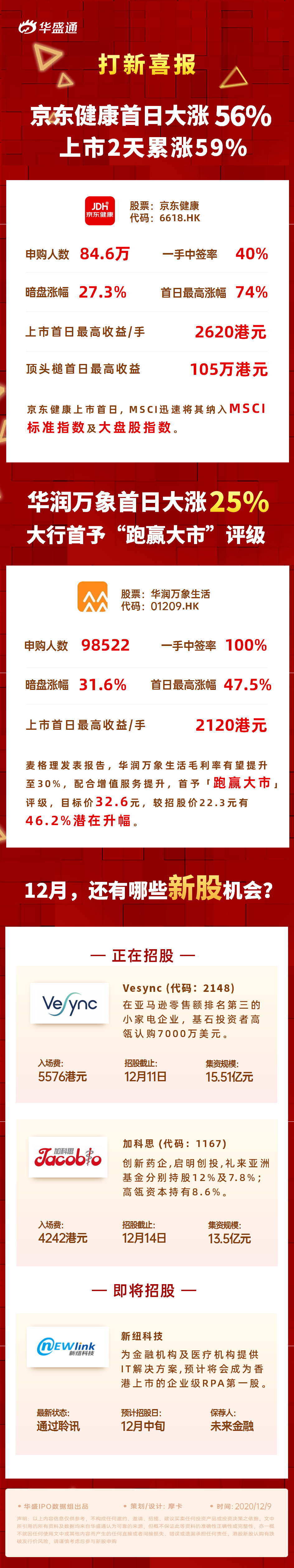 另一只新股华润万象生活昨日首挂,盘中一度涨47.5%,不计手续费,每手最多赚2120港元,一手中签率100%。当日,麦格理发表报告,华润万象生活毛利率有望提升至30%,配合增值服务提升,首予「跑赢大市」评级,目标价32.6元,较招股价22.3元有46.2%潜在升幅。