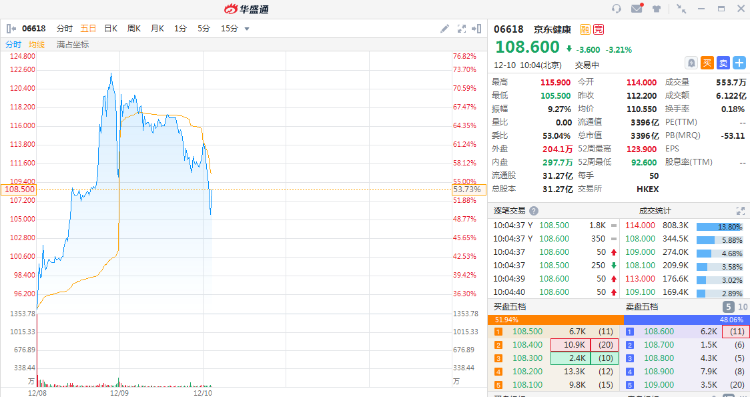 12月10日消息,京东健康由涨转跌,现跌3.21%,报108.6港元,最新市值3396亿港元。京东健康于12月8日正式登陆港交所,上市首日收涨55.85%,上市次日收涨2%。