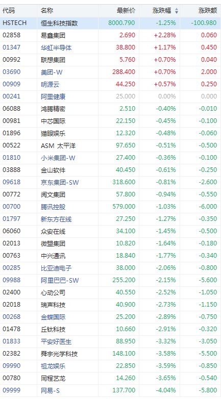 易鑫集团逆市涨超2%,华虹半导体逆市涨1%;网易大跌4%,舜宇光学、平安好医生、祖龙娱乐跌超3%,比亚迪电子、阿里巴巴跌超2%。