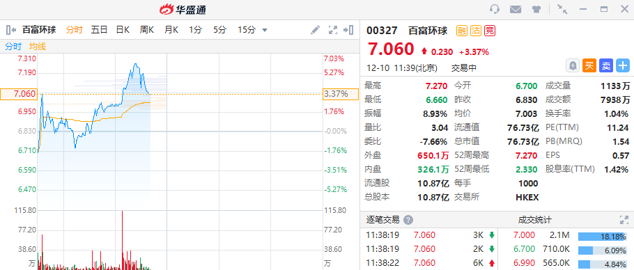 华盛资讯12月10日讯,百富环球(00327)盘中大涨,股价再刷新52周新高。截至发稿,百富环球涨3.37%,现报7.06港元每股,成交量达1133万股,成交额7938万港元,三个月累计涨幅超70%。